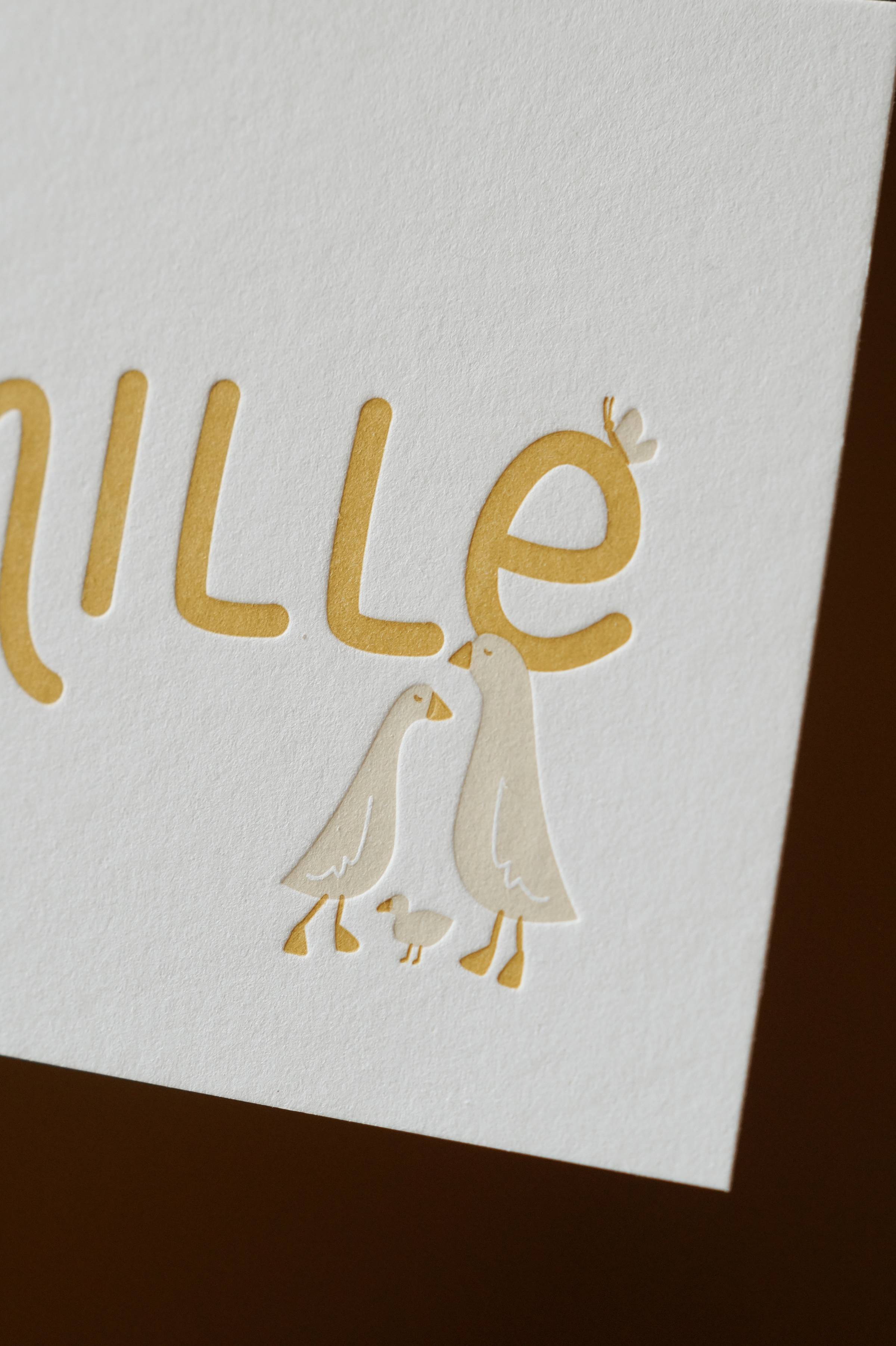 Welkom Camille!-- kaartje in de kijker -- Dit schattige letterpress kaartje is eentje om te koesteren! Ook voor mij trouwens, want het is het eerste kaartje dat van schets, naar ontwerp, naar druk helemaal in huis werd gemaakt...